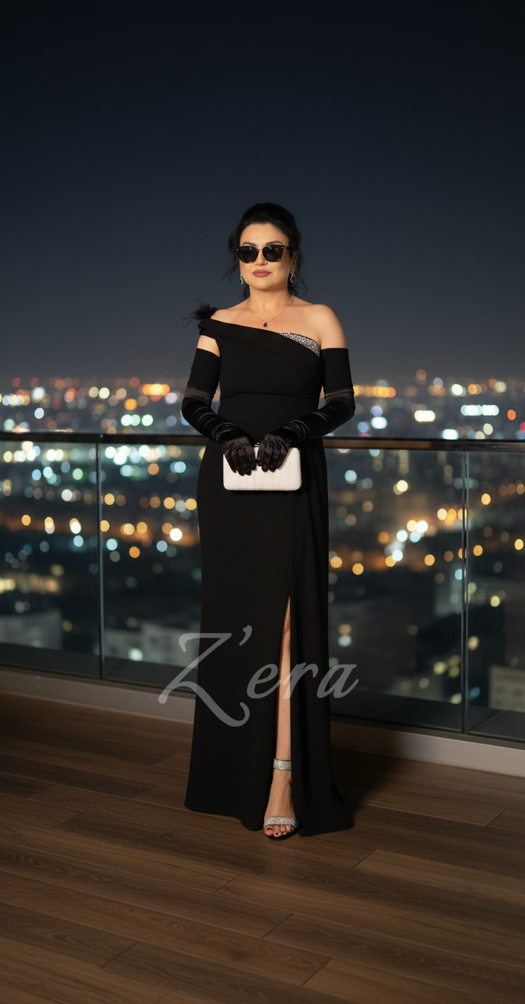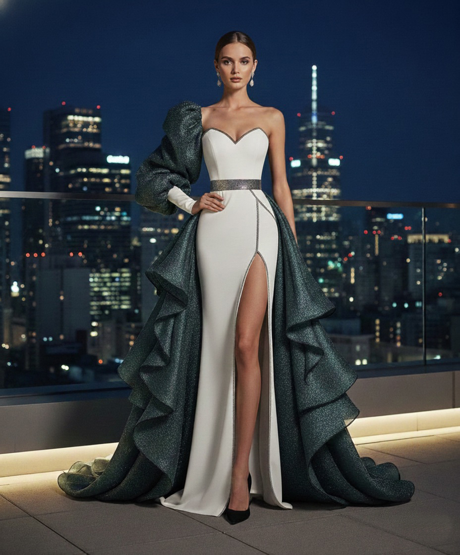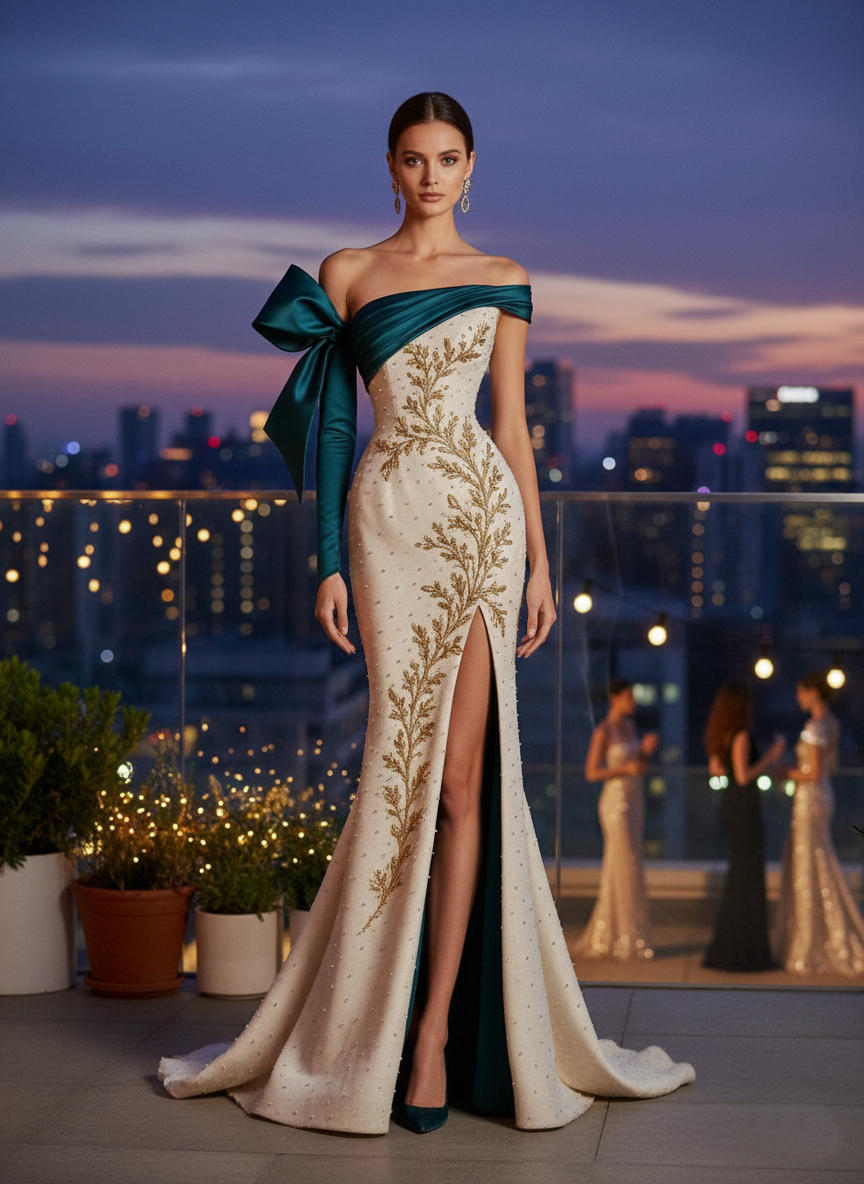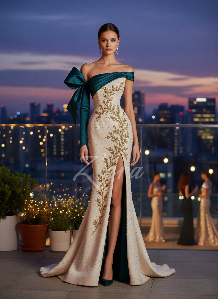 Uzun bacak dekolteli tafta kumaş elbisemizin üzerine, altın sim brode ve dağınık inciler serpiştirip, asimetrik kesim fiyonklu saten tek kolla tamamladık.
