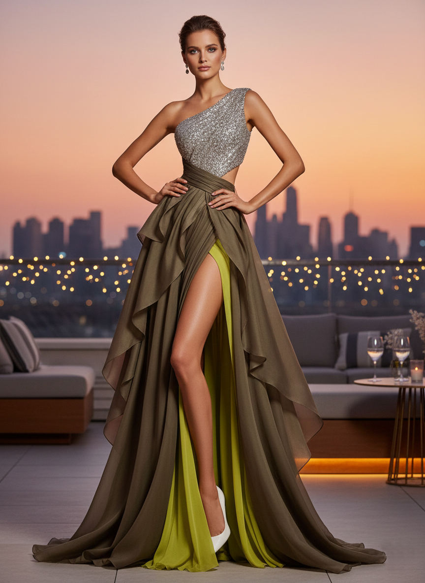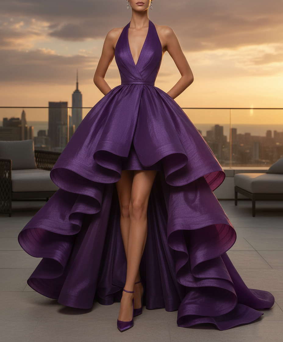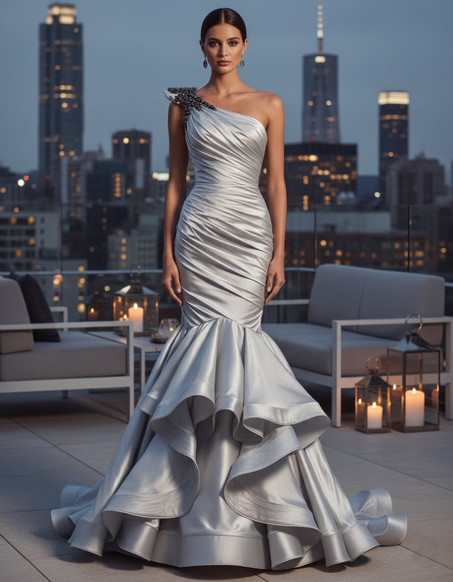 Işıltılı tafta kumaşın asimetrik volanlarla elbiseye dönüşümü...