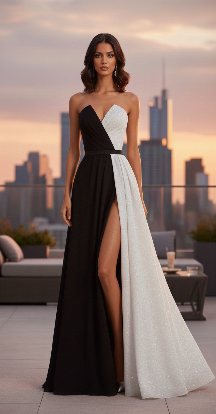 Uzun bacak dekolteli elbisemiz kontrast renkler bir araya getirilerek simli kumaştan tasarlandı. Renk kataloğumuzda bulunan renklerden kendi kontrastınızı seçebilirsiniz.