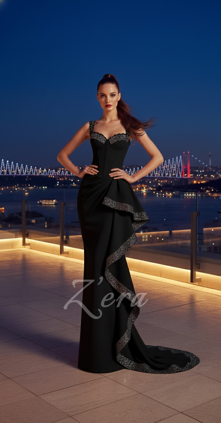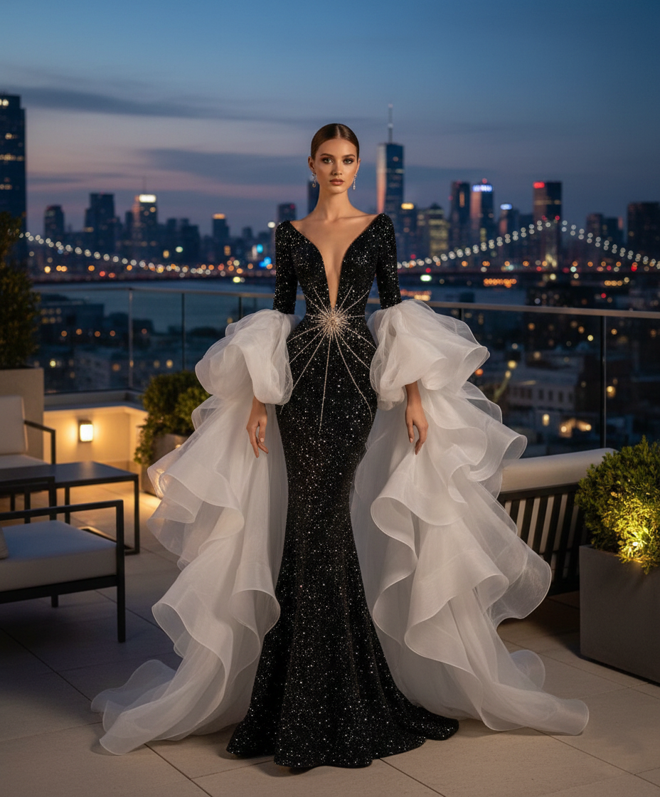 Payet kumaş balık elbisemize Strass taşlarla güneşi taşıyıp, kontrast organze fırfır etolle tamamladık.