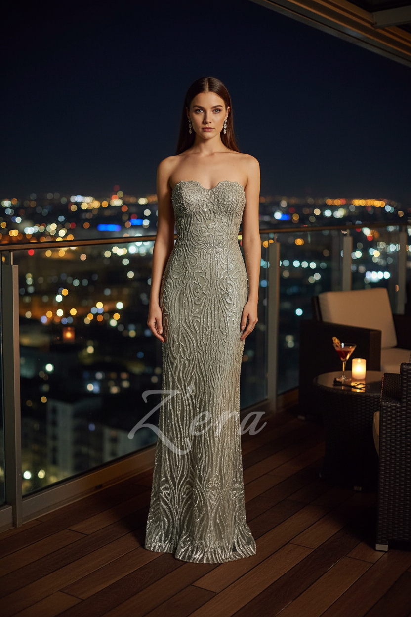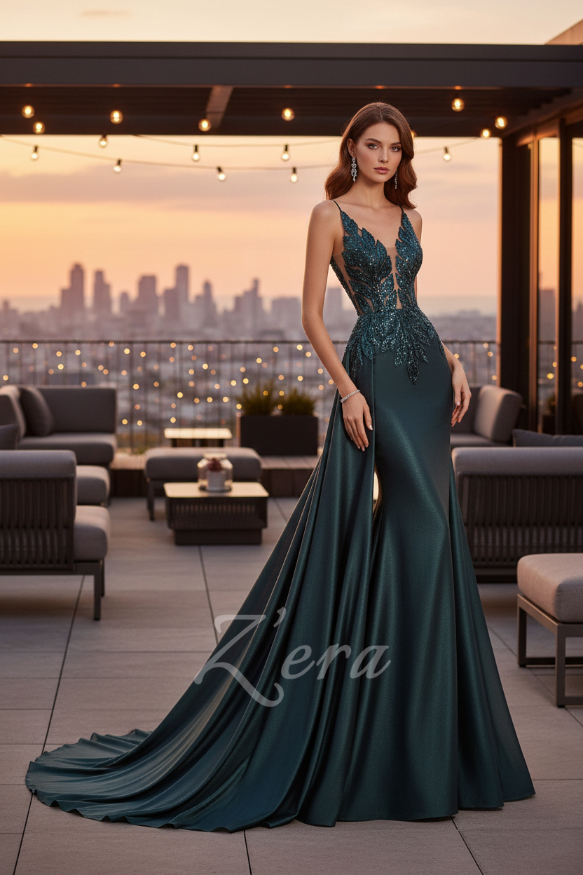 Pul+payet aplikeli beden, spandeks saten etek ve ihtişamlı kuyruk detayı ile elbisemiz gecenin zümrütü...