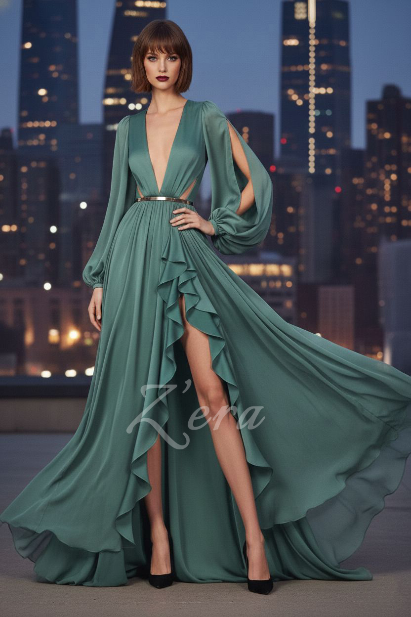 Uzun bacak ve derin "V" dekolteli ithal şifon fırfırlı elbisemizi lame kemerle tamamladık.