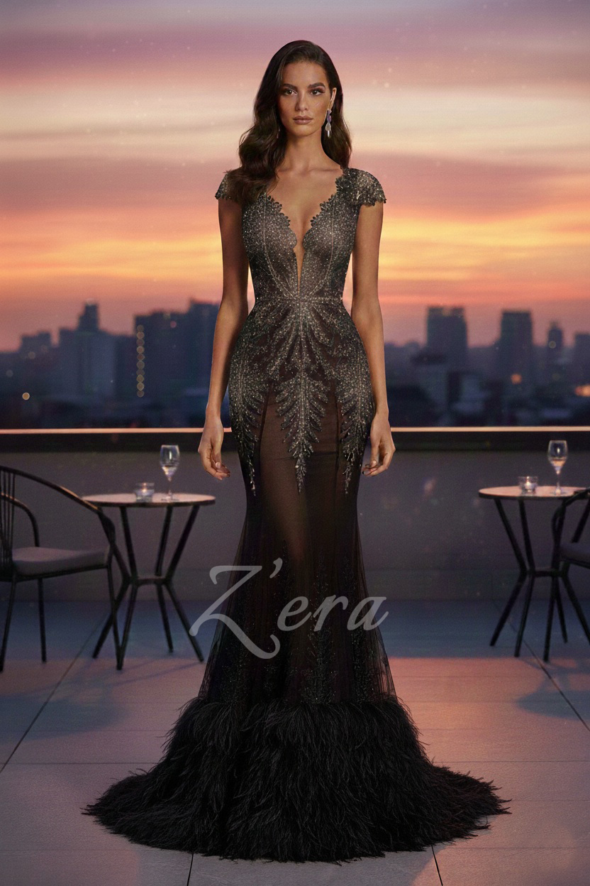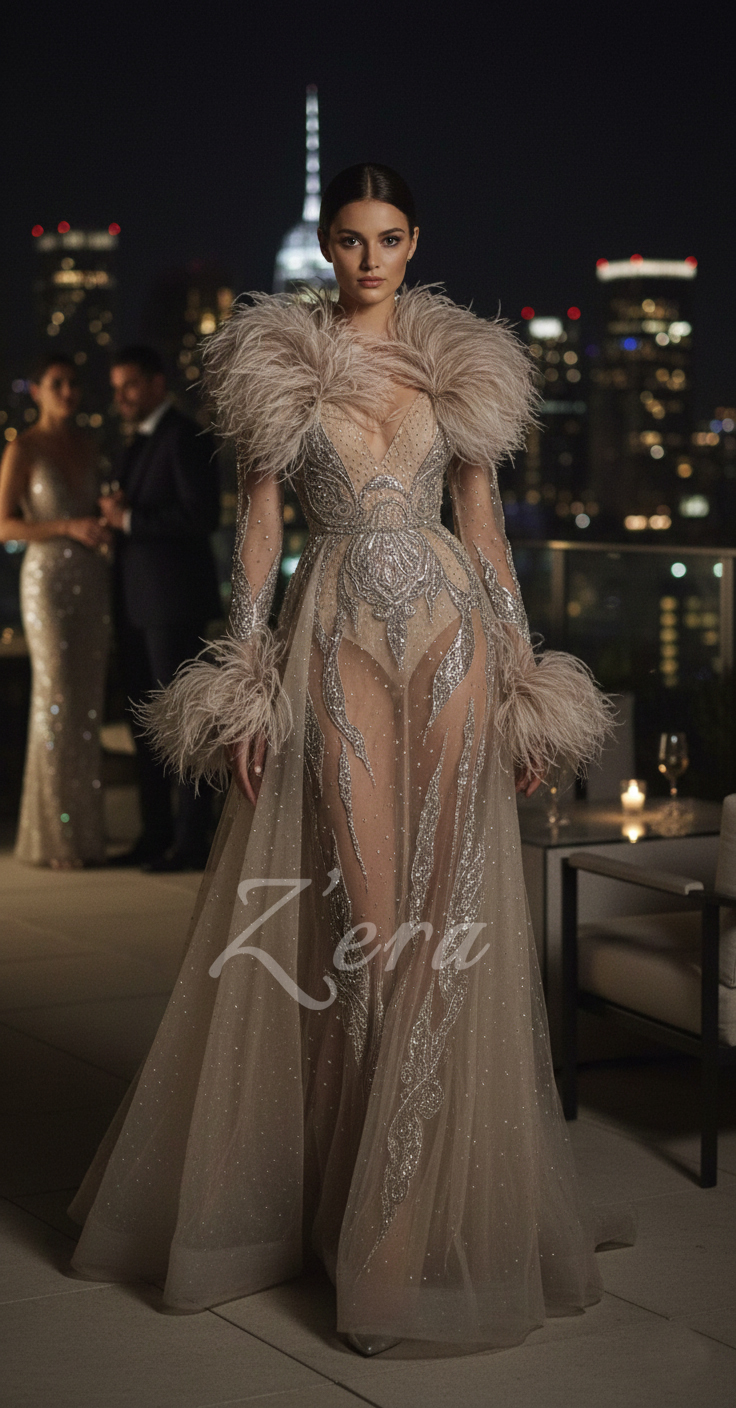 Elbisemizin üst kesiminde Strass taşlarla süslenmiş brode tül kullanıp, etek kısmını 3d efektli lüks yaprak dantel ve saçaklarla tamamladık.